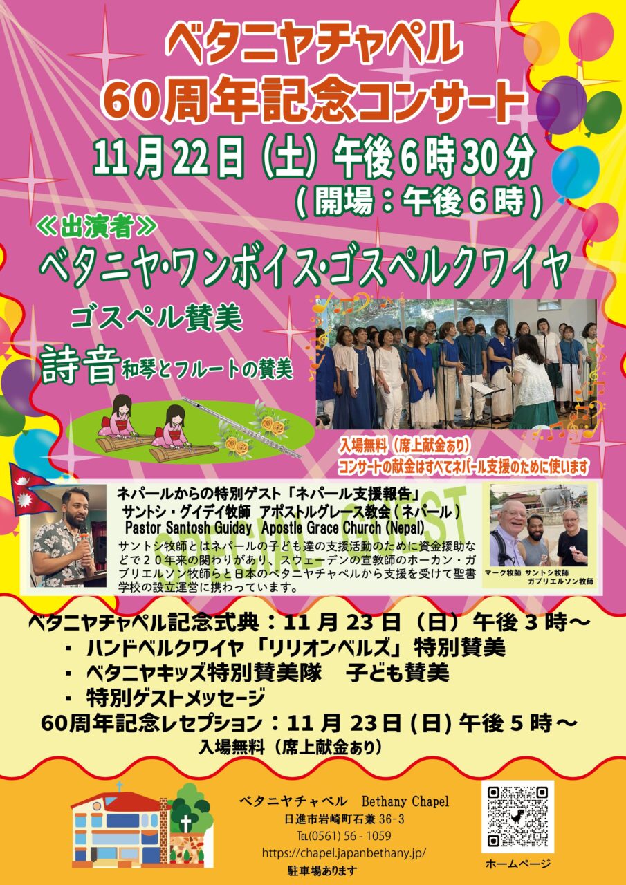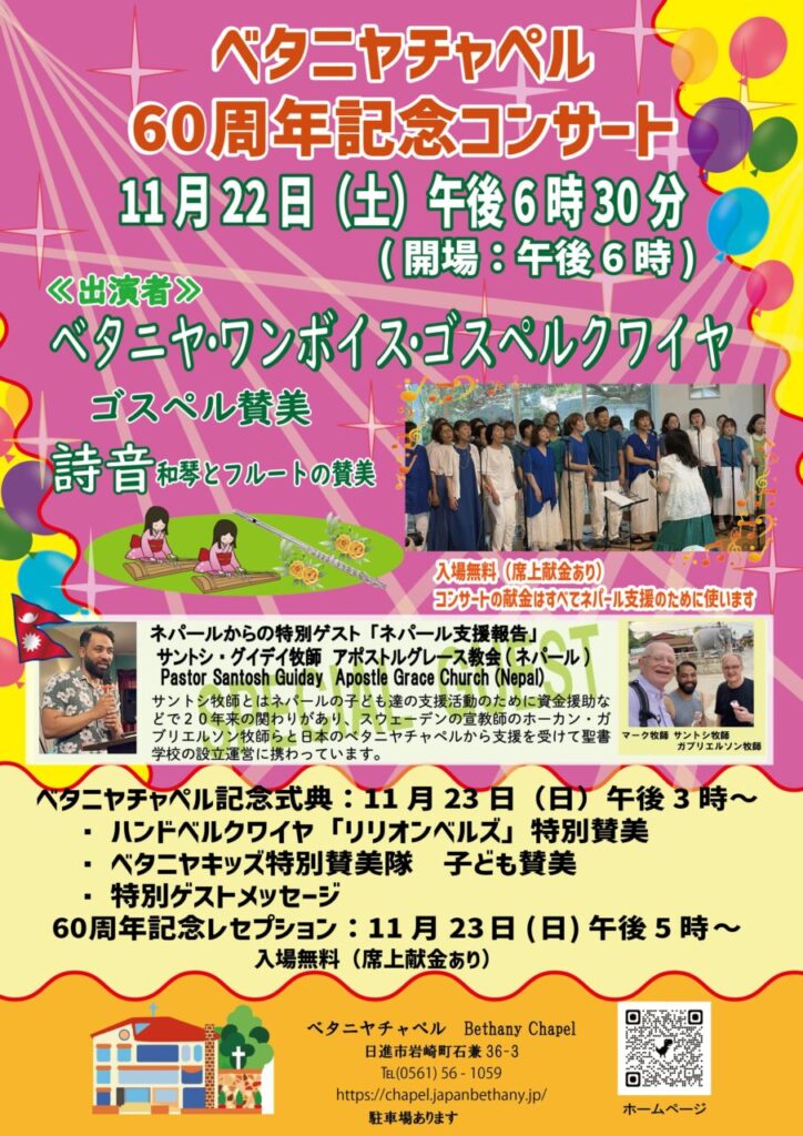 ベタニヤチャペル60周年記念 最終更新日時 : ベタニヤ幼稚園 ベタニヤチャペル60周年記念 ベタニヤチャペルは創立60周年を迎えました。主に守られ共に歩んだ60年を記念し、11月22日午後6:30 記念コンサート、11月23日午後3:00 記念式典を行います。多くの皆様と、主から賜った恵みと祝福を感謝し共に喜びの時としたいと思います。ぜひ、記念コンサート、記念式典へお越しください。